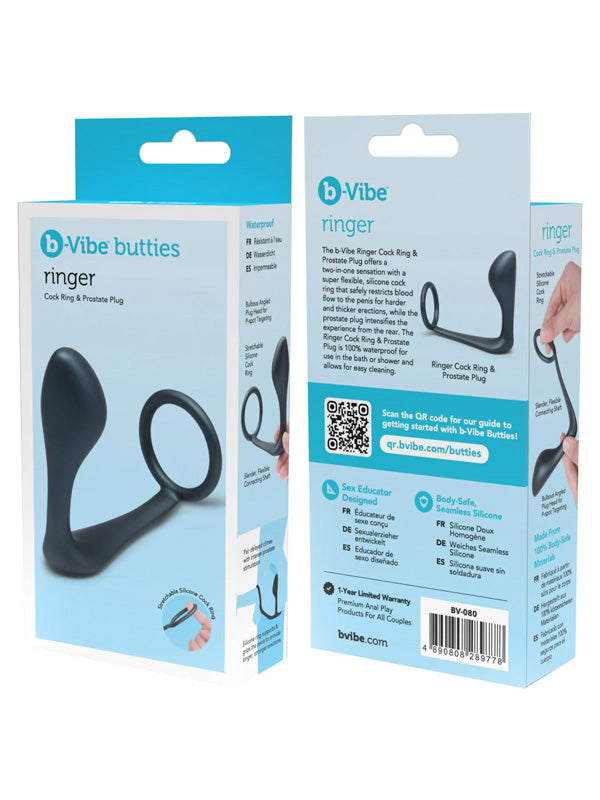 Combine the best of both worlds with the b-Vibe Ringer Cock Ring and Prostate Plug! This two-in-one toy features a super flexible silicone cock ring to restrict blood flow for harder and thicker erections, while the prostate plug intensifies the experience from the rear.