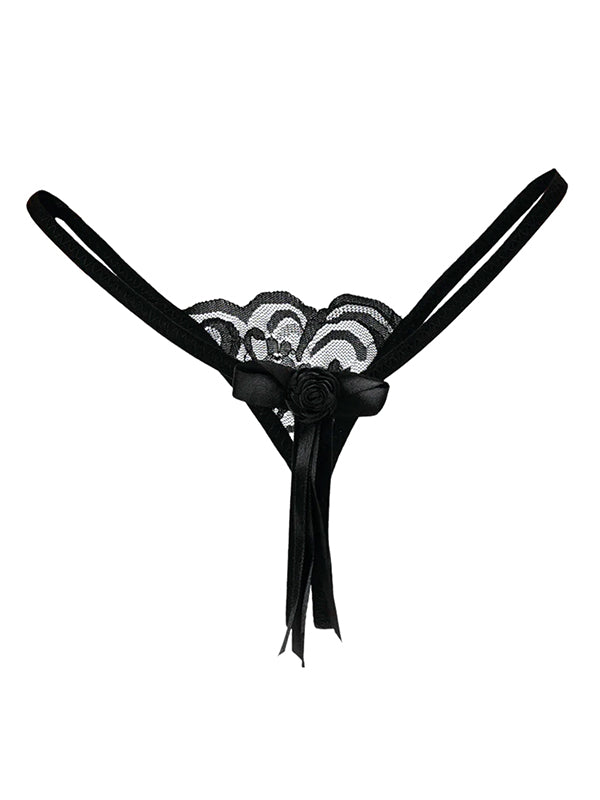 - Black one-size thong with lace front and back decorated with a bow