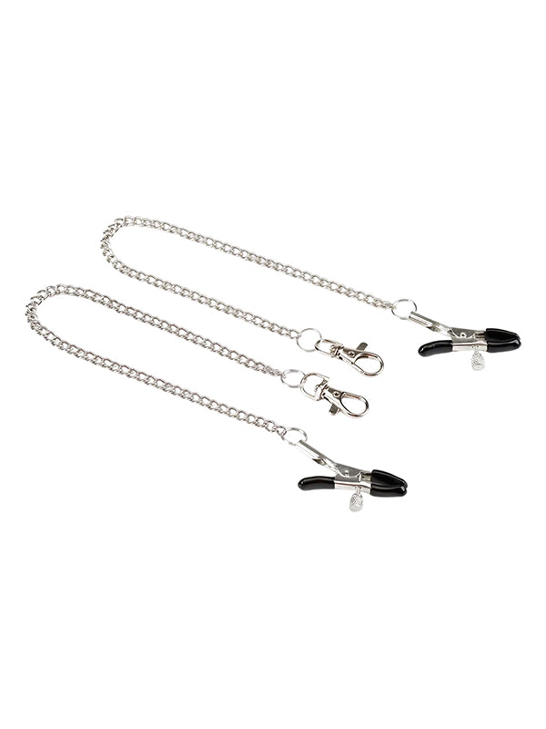 - Metal nipple clamps with chain and lobster clasp for attaching to the ball gag or other accessories
