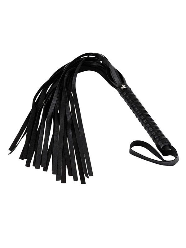 - Faux leather flogger with wrapped handle and a wrist loop (full length: 54 cm; handle diameter: 2.1 cm)