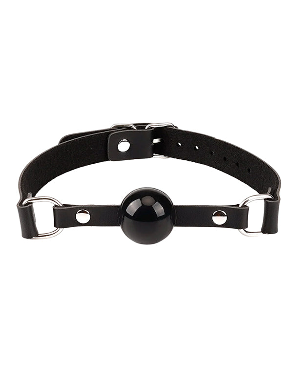 - Ball gag with black faux leather straps and buckle closure (length: 58 cm; adjustable size: 40-52 cm; ball diameter: 3.5 cm)