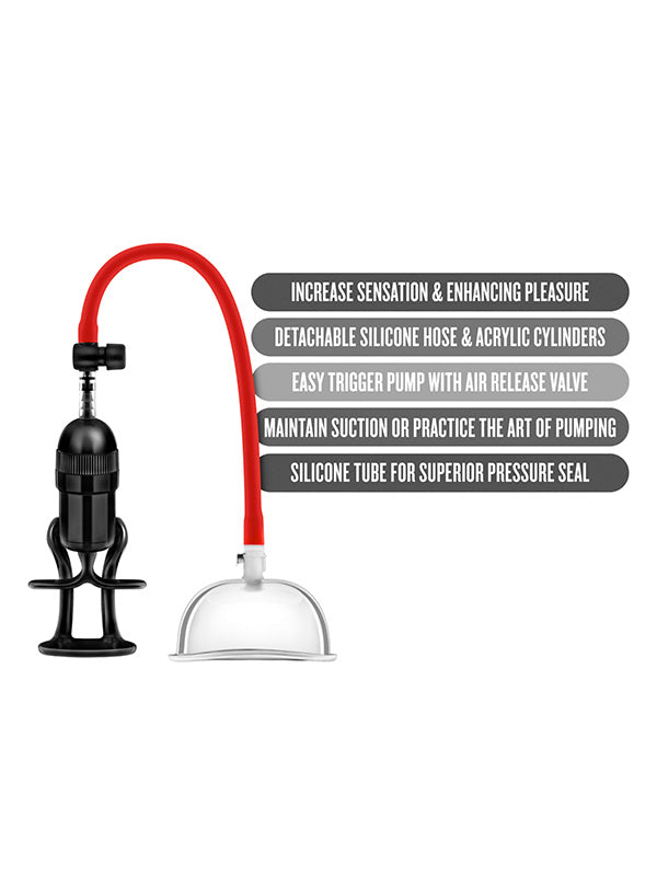 The Temptasia Intense pussy pump system is a professional-grade pussy pump for serious vulval pumping. Place the cup over your vulva and use the trigger to create the desired suction. The pump features an air-release valve for easy removal. The cup can be detached leaving your vulva suctioned to the cup. You can maintain constant suction or practice pumping, releasing and pumping again to simulate oral sex.