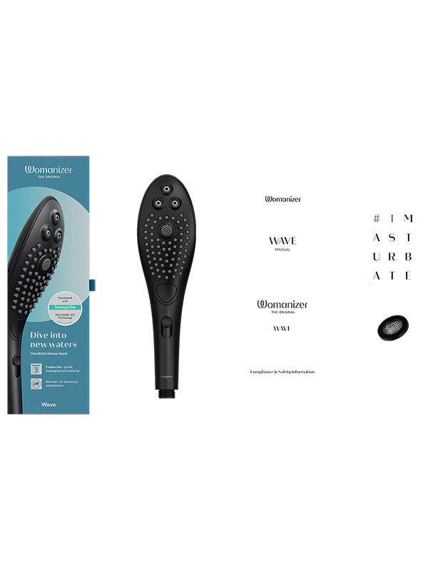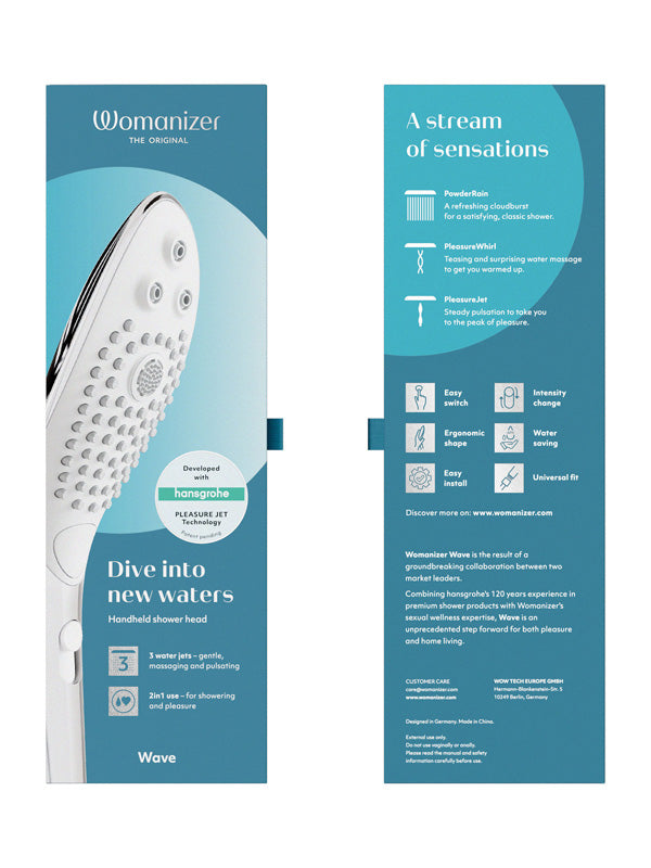 - Includes: Womanizer Wave shower head, sieve seal, quick start guide, safety information