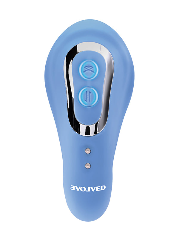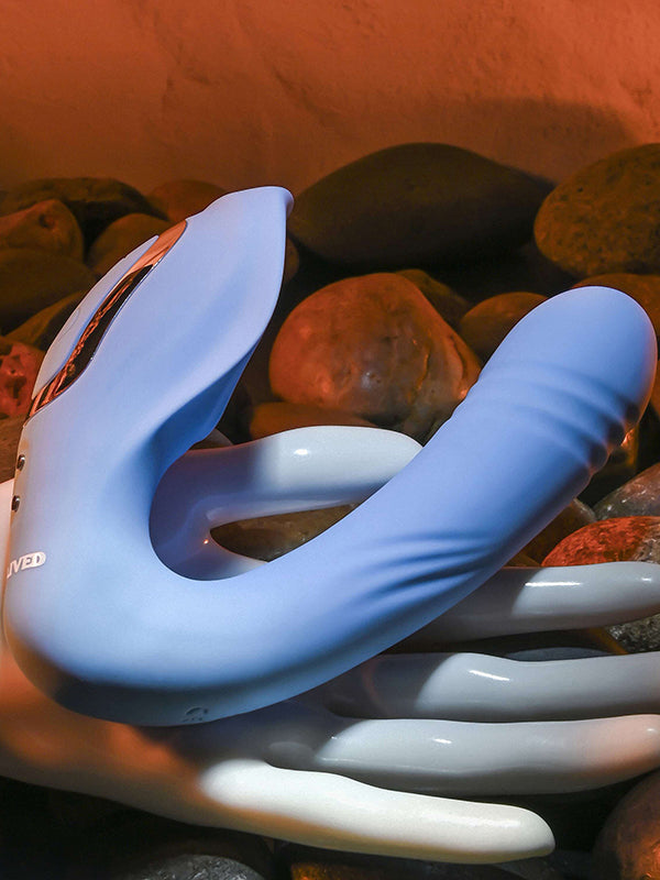 Tap & Thrust dual stimulation vibrator combines two unique sensations for internal bliss. The shaft is equipped with a powerful thrusting motor and vibrating head while the wide, wing-shaped external motor stimulates the clitoris with a tapping motion. Both powerful motors feature 7 speeds and functions for you to explore.