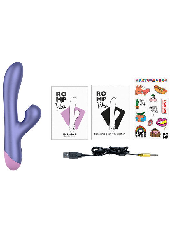 - Includes: ROMP Pulse, Quick start guide, Safety instructions, Stickers, USB charging cable (AC adapter not included)