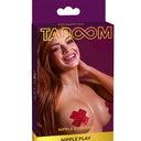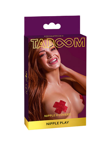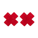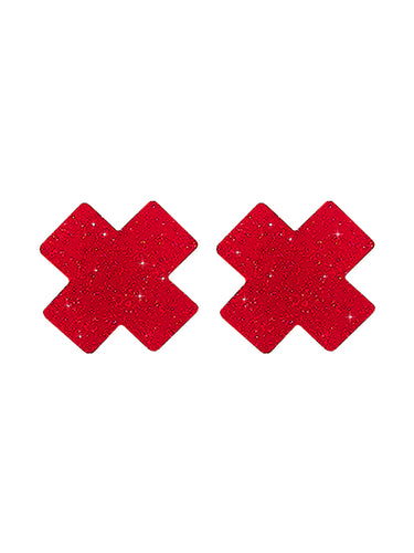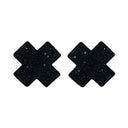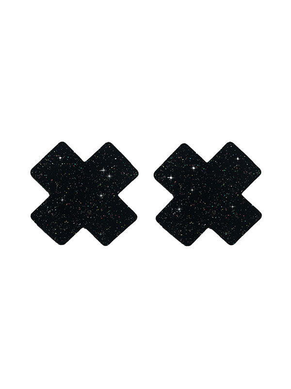 TABOOM shiny glitter cross nipple pasties. The pasties are self-adhesive.