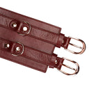 Wine Red waist cuff made from durable cow leather with rose gold hardware. The belt is padded with black, silky soft leather and features 6 D-rings which allow you to attach ropes, cuffs and other bondage accessories. Perfect match with the other Wine Red series accessories.
