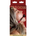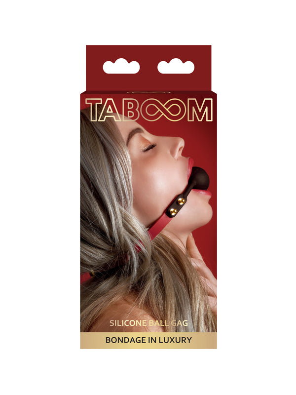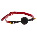 TABOOM Bondage collection ball gag is made of gorgeous, deep red faux leather straps and features a smooth black silicone ball and gold metal details.