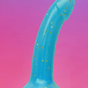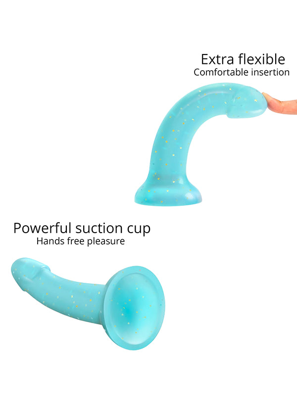 Love to Love Dildolls Nightfall is a silky smooth transparent blue silicone dildo filled with golden stars. Its flexible curved shape ensures comfortable G-spot or P-spot stimulation. The dildo features a strong suction cup so it can be attached to any smooth, hard surface for hands-free pleasure. After use, clean the dildo with warm, soapy water or with a suitable sex toy cleaner.
