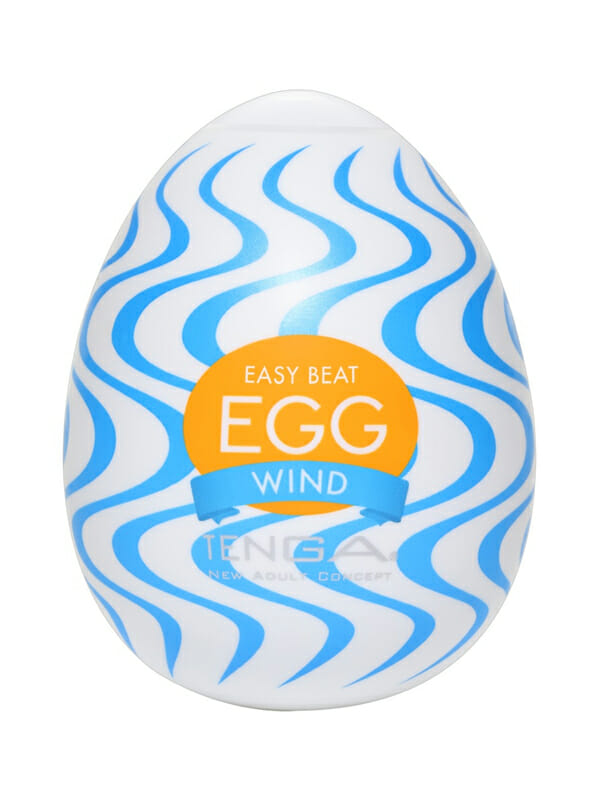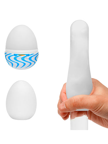Fun on the go! Tenga Wonder Egg Wind compact disposable masturbator in an egg-shaped case with a stimulating wave texture inside. The very flexible masturbator sleeve is inside the egg-shaped case and can be used for a hand job with the included lubricant. The masturbator is extremely flexible made from TPE (porous) and is placed over the penis like a sleeve which adapts to the size of the penis.