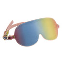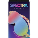 The Spectra Bondage blindfold is made from faux leather in a slightly shiny, rainbow colour. The blindfold features a comfortable shape and a gold-coloured metal buckle.