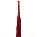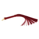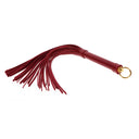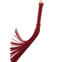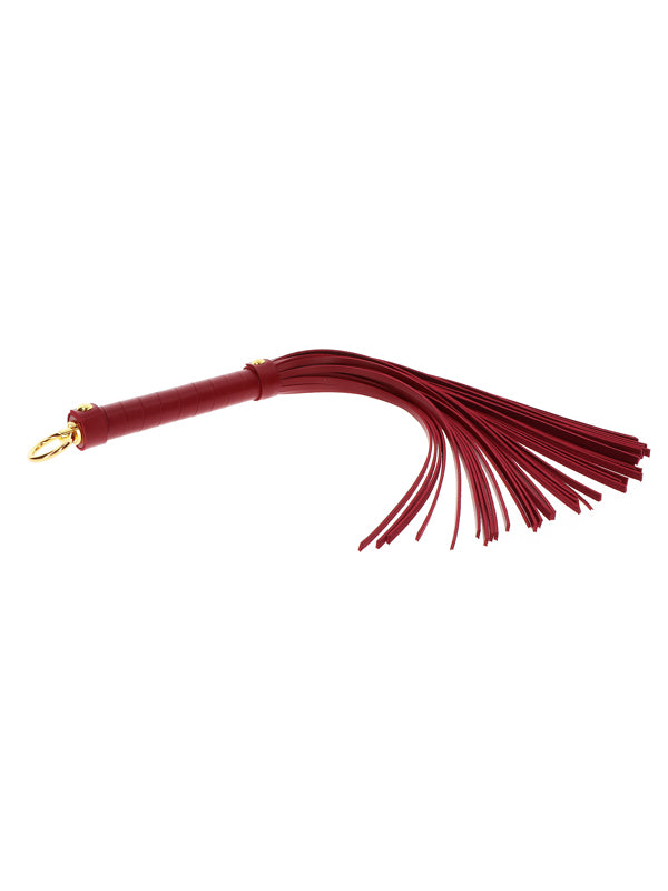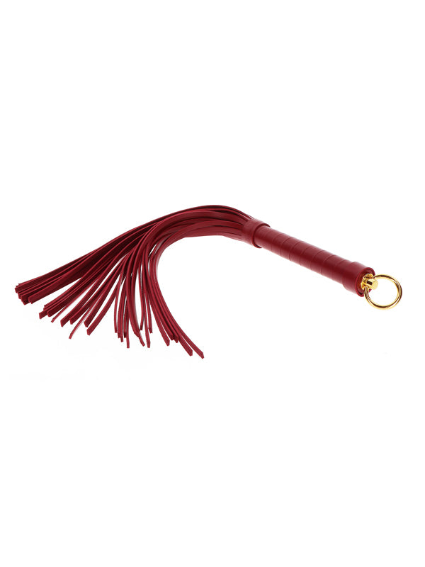TABOOM Bondage collection large whip is made of gorgeous, deep red faux leather and features a sturdy gold hanging ring at the base of its handle.