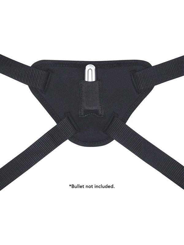 The elastic pouch located behind the harness dildo base pad allows for the addition of a bullet vibrator (not included), enhancing your strap-on sexperience further.