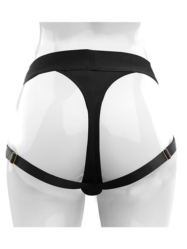 Mythology Fantasy black strap-on panties are made from a stretchy, comfortable material. The panties feature a wide belt and two adjustable leg straps. The strap-on fits any dildo with a diameter of up to 5cm and a flared base.