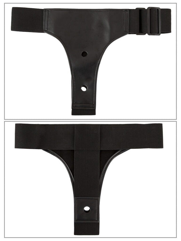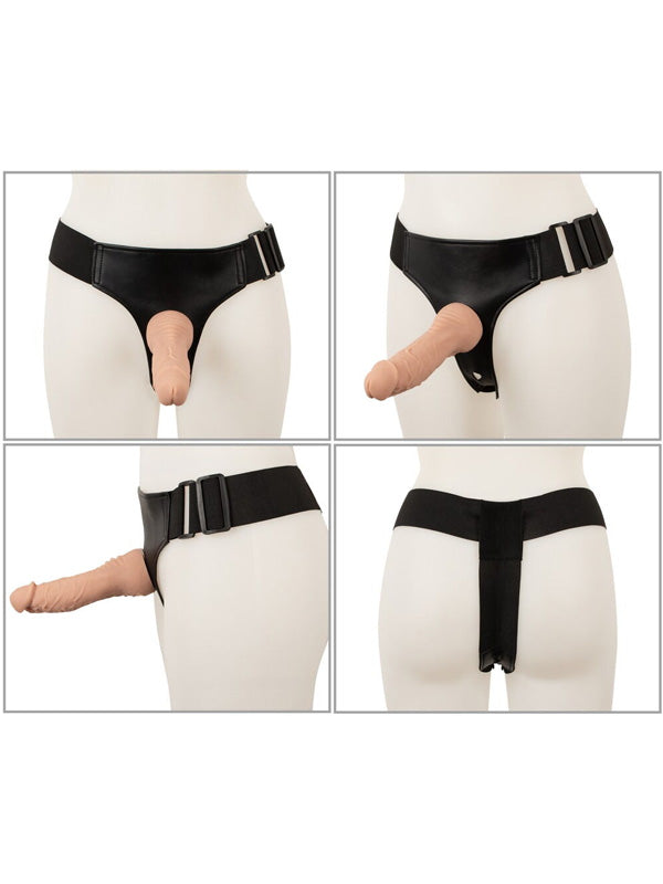 The strap-on harness made of faux leather with wide stretch straps is adjustable in size so that everything fits tightly and comfortably. The vibrator and dildos are simply screwed into the 3 openings of the harness with their counter plates as desired.
