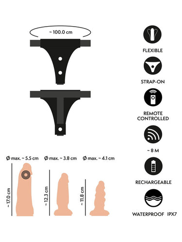 - Includes: Harness, Vibrating dildo, 2 dildo plugs, Remote control, CR2032 battery, USB charging cable