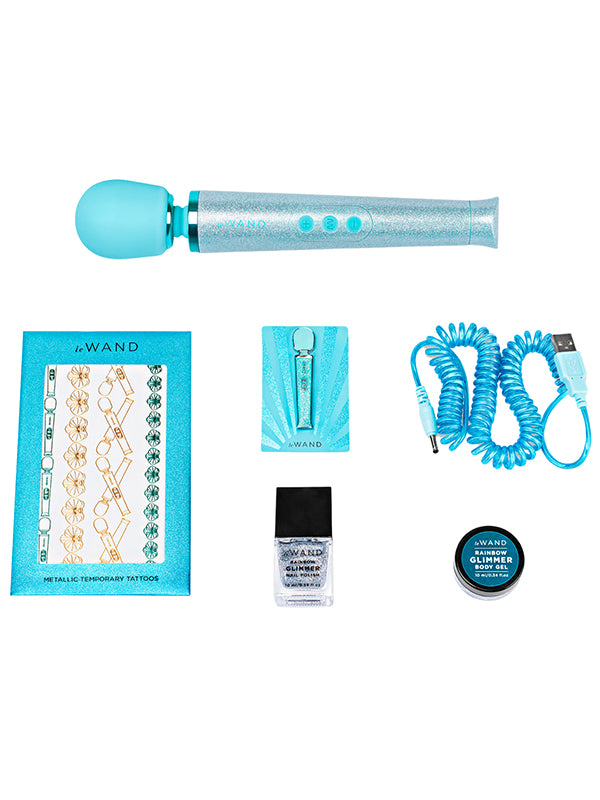 - Includes Wand enamel pin, Glimmer nail polish, Glimmer body gel, Sparkly temporary tats, Pleasure guide, Glitter travel case, USB cable