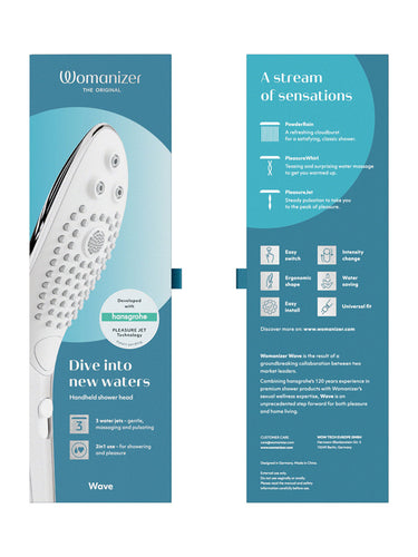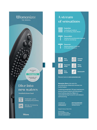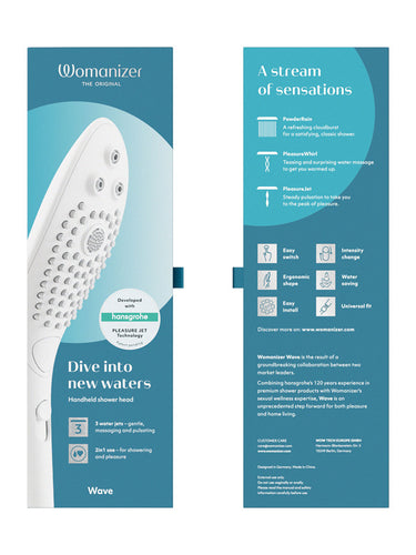 - Includes: Womanizer Wave shower head, sieve seal, quick start guide, safety information