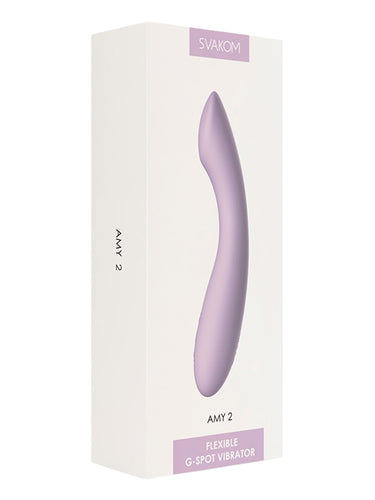 Svakom Amy 2 features an ergonomic curved shape and a flattened tip which is perfect for direct G-spot stimulation. The flexible silicone vibrator is velvety soft, made of body-safe silicone.