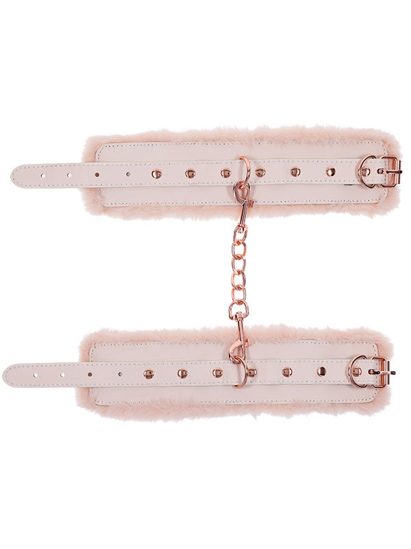 Wrapped in the softest light peach-colored faux fur, the cuffs provide a luxurious sensation against your skin, adding a touch of sophistication with a subtle shimmer. Effortless to wear and remove, the secure clasp ensures a teasing release when you're ready.