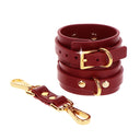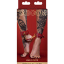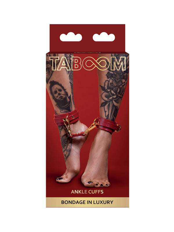 TABOOM Bondage collection ankle cuffs are made of gorgeous, deep red faux leather with gold metal details. The easy-to-use cuffs with solid metal lobster clasps are strong, made of high-quality PU Leather and are perfect for an excellent BDSM session. The cuffs are also great to wear as a sexy accessory.