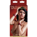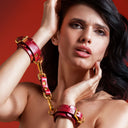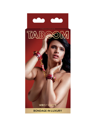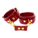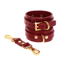 TABOOM Bondage collection wrist cuffs are made of gorgeous, deep red faux leather with gold metal details. The easy-to-use cuffs with solid metal lobster clasps are strong, made of high-quality PU Leather and are perfect for an excellent BDSM session. The cuffs are also great to wear as a sexy accessory.