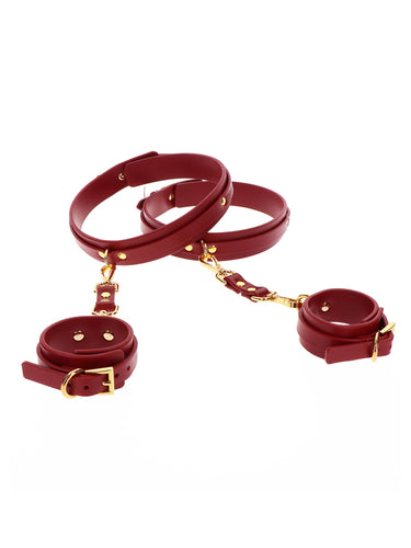 TABOOM Bondage collection Wrist To Thigh cuff set is made of gorgeous, deep red faux leather and comes with two thigh cuffs and two wrist cuffs. Clip the easy-to-use wrist cuffs with the solid gold metal lobster clasps to your thigh cuffs for real restriction. The cuffs are strong, made of high-quality PU Leather and are perfect for an excellent BDSM session. The cuffs are also great to wear as a sexy accessory.