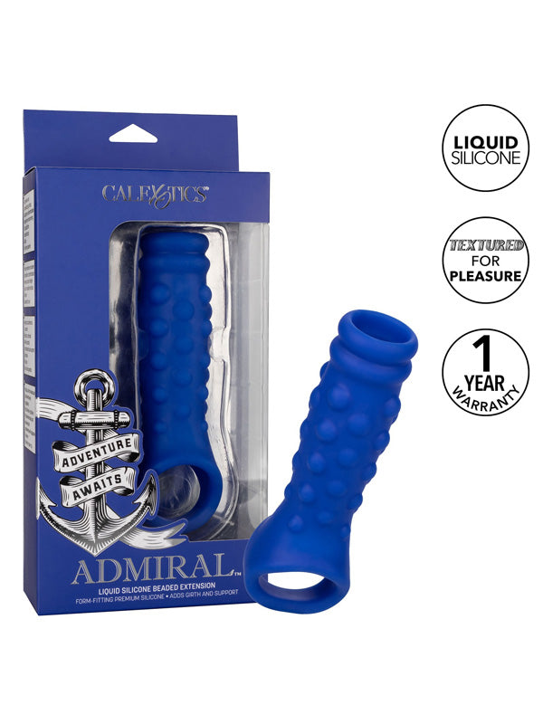 Admiral Beaded is a silicone penis extension that wraps tight around the penis to increase girth, support, and maximize arousal while supporting erection. The ultra-stretchy material and spacious chamber will fit most penises while the built-in scrotum strap provides increased stimulation and support. The flexible sleeve is made from soft, body-safe liquid silicone for a plush, tight feel.