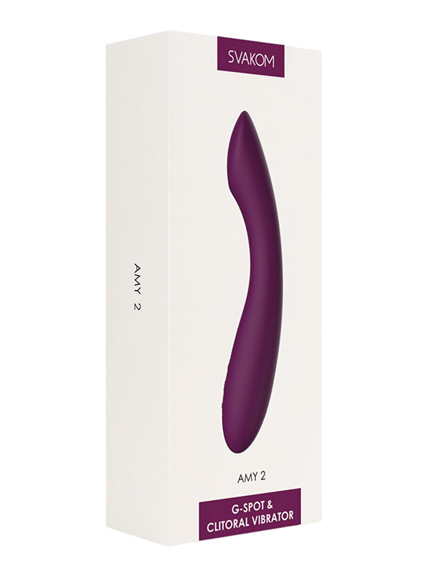 Svakom Amy 2 features an ergonomic curved shape and a flattened tip which is perfect for direct G-spot stimulation. The flexible silicone vibrator is velvety soft, made of body-safe silicone.