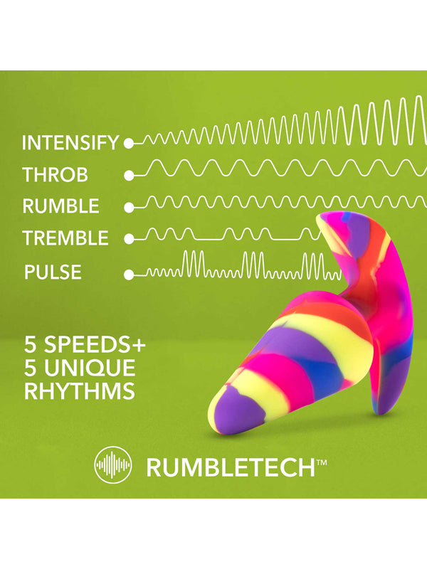 Blush Avant Free Spirit vibrating butt plug in bold colour combination. The plug has a tapered tip for easy insertion and features 10 vibrating functions – 5 speeds and 5 patterns. IPX7 waterproof for bath and shower play and easy cleaning, Free Spirit is silky smooth and made of Puria silicone, making it body-safe, phthalate-free, latex-free, and fragrance-free.