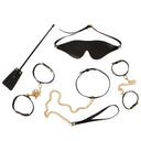 - Includes: 1 pair of ankle cuffs, 1 pair of handcuffs, 1 x blindfold, 1 x collar, 1 x leash, 1 x mini paddle