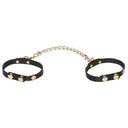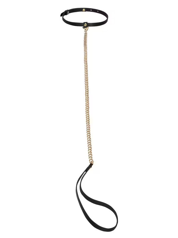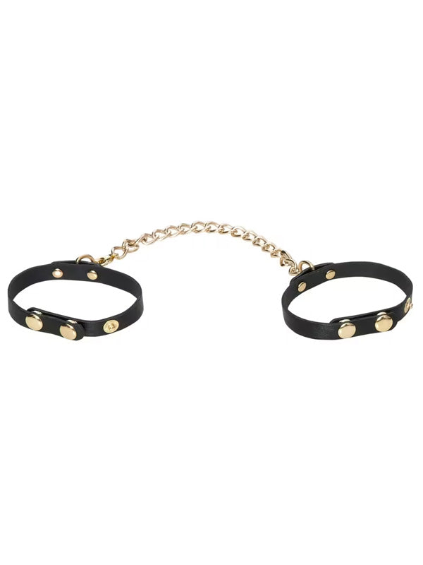 This Bondage Set from Bad Kitty is made out of delicate black imitation leather with gold-coloured hardware. The elegant set, perfect for bondage beginners, contains 6 classic accessories for kinky fun: a collar, leash, blindfold, hand and ankle cuffs, and a mini crop. The cuffs can be put on and adjusted quickly, and the leash and connecting chains have a convenient clasp on one end for easy detaching.