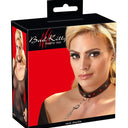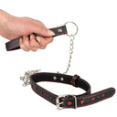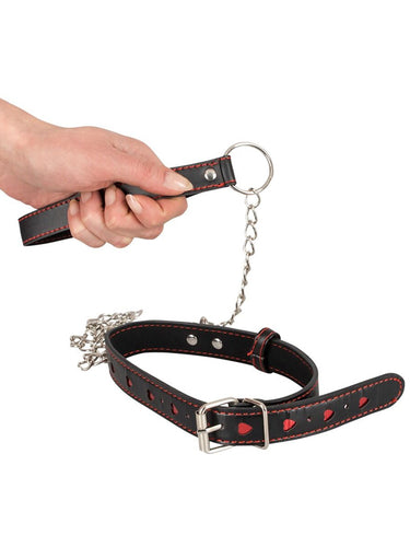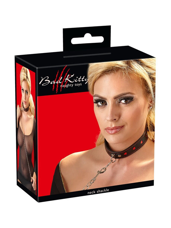 Bad Kitty collar and leash set decorated with red punched-out hearts. The collar and hand loop of the leash are in a beautiful black leather look with red seams. The chain leash and metal elements are made from metal in shiny silver colour. Collar features a D-ring at the front to attach the included leash.