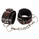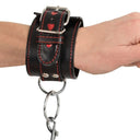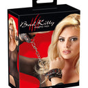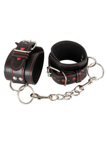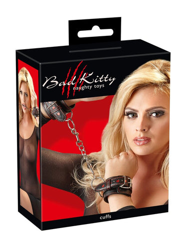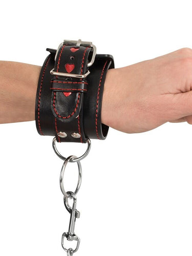 Bad Kitty black, leather-look hand cuffs, decorated with red stitching and small, punched out red hearts. The cuffs feature an adjustable buckle closure and a removable connection chain (15 cm) with snap hooks. These hand cuffs are also suitable for thin wrists (circumference can be adjusted from 17 to 27 cm).
