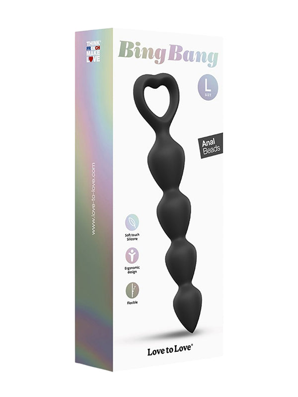 The Love to Love Bing Bang anal beads feature a heart-shaped finger loop base for easy insertion and removal. The 4 beads of graduated sizes ensure smooth insertion for complete comfort. The beads are made from smooth, body-safe silicone and the large size makes them an ideal choice for experienced users.