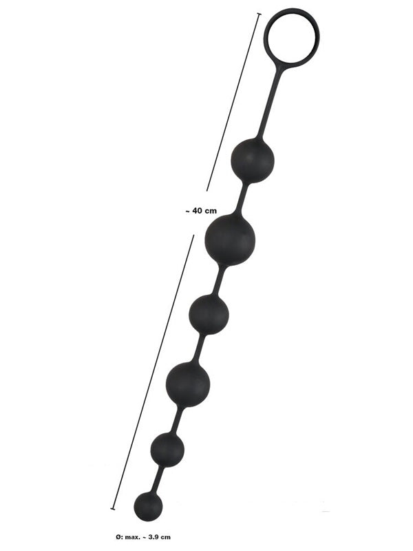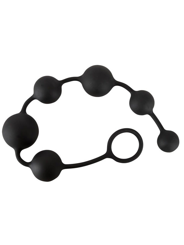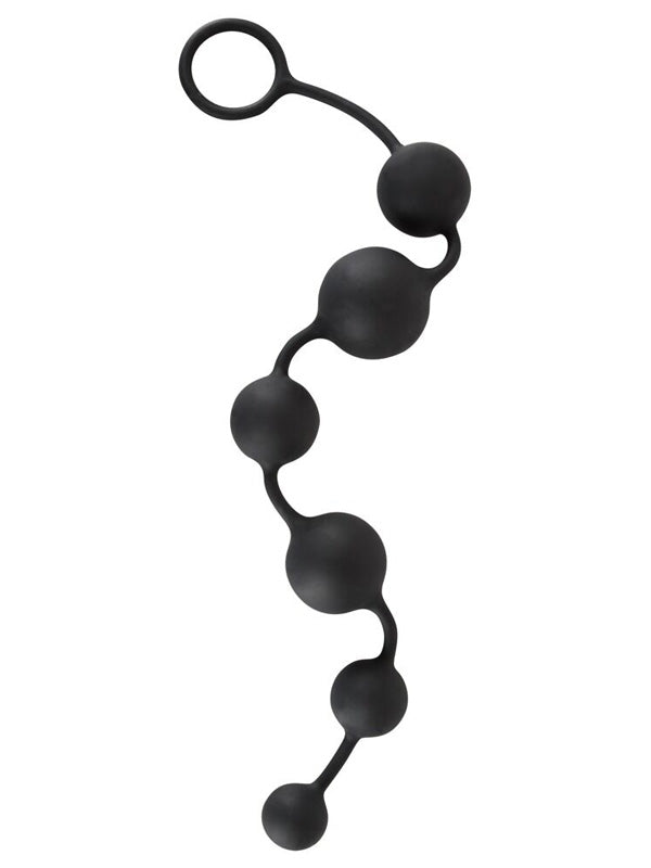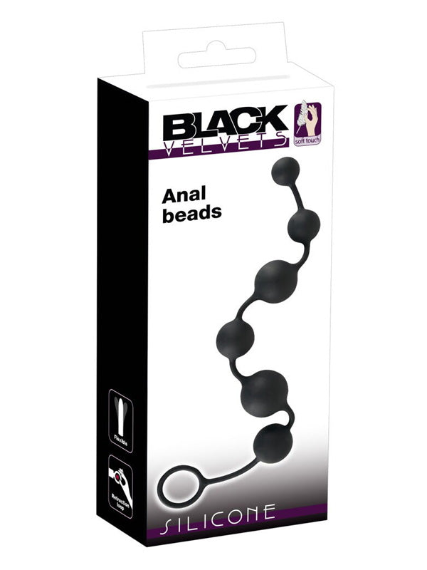 Pure pleasure, bead for bead! The Black Velvets classic anal beads feature six black beads in different diameters on a long silicone chain. All the beads are different sizes varying from 2.3-3.9 cm. The bead chain is flexible and has a retraction loop at the end for safe anal play.