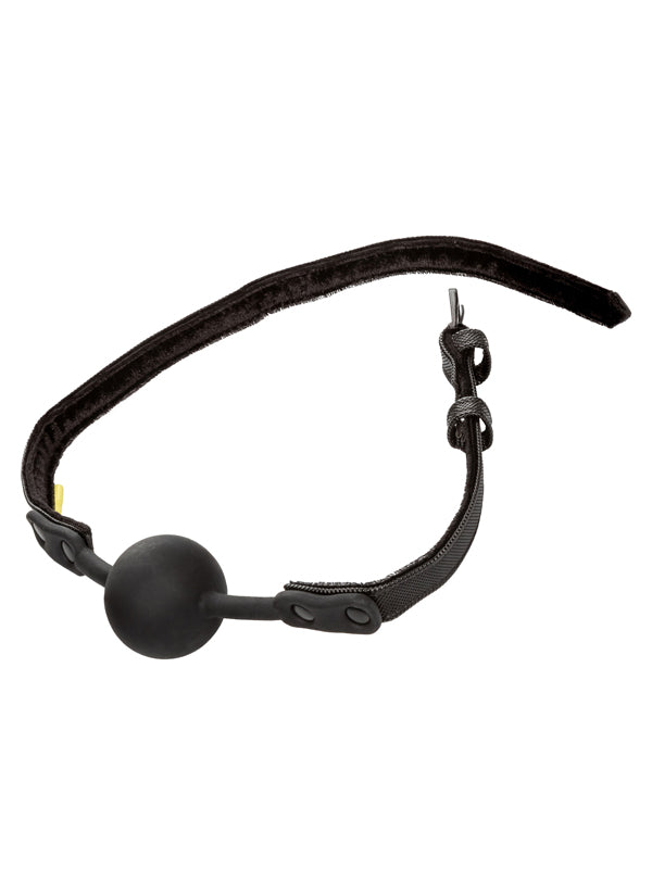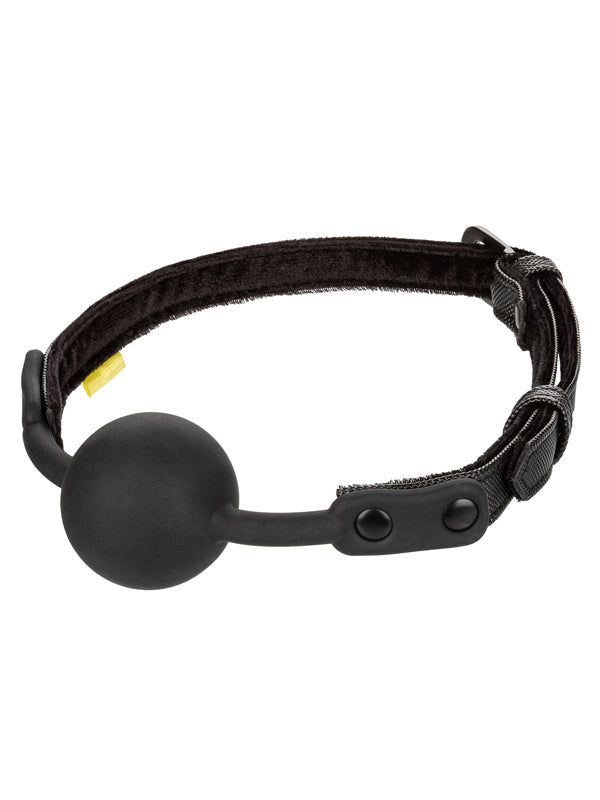 The CalExotics Boundless firm yet pliable, body-safe silicone ball gag features double-stitched, vegan leather straps with a plush interior and buckle closure.
