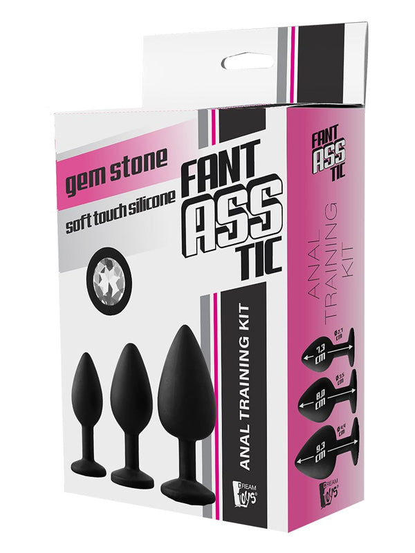This Dream Toys Fantasstic butt plug kit features 3 anal plugs in 3 different sizes. Each plug is made of silicone that is soft to the touch and has a shiny white gem stone in the flared base.