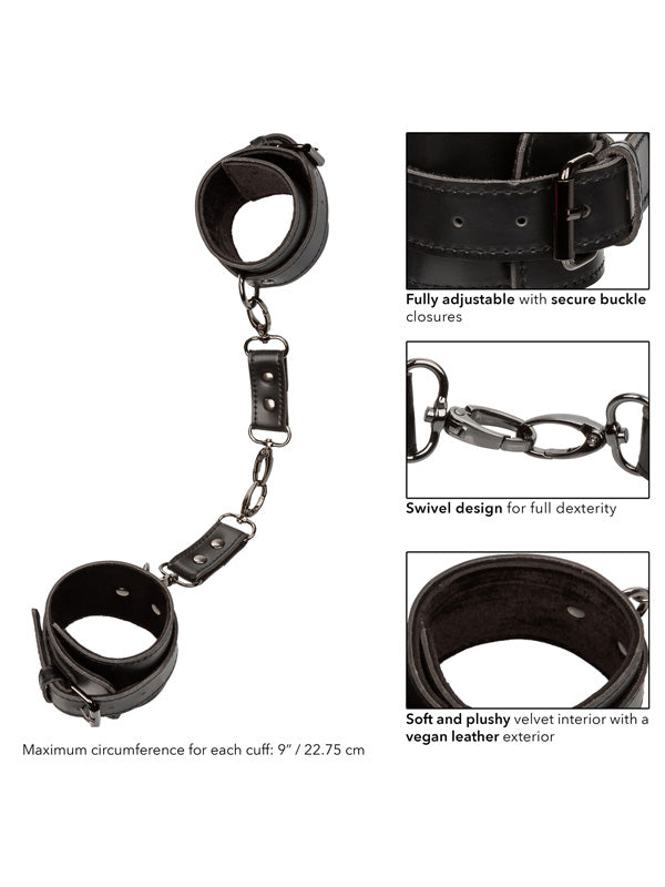 Discover the allure of restraint play with the CalExotics Euphoria Collection hand cuffs. This set offers two wrist restraints designed for style and functionality. Enjoy a customised fit with adjustable buckles and luxurious velvet interiors paired with sleek vegan leather exteriors. Universal clasps and swivel D-rings provide flexibility for diverse positions. Crafted for durability, these cuffs feature double padding and stitching. Non-tarnishing metal accents add sophistication, elevating intimate moments.