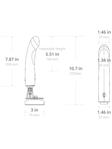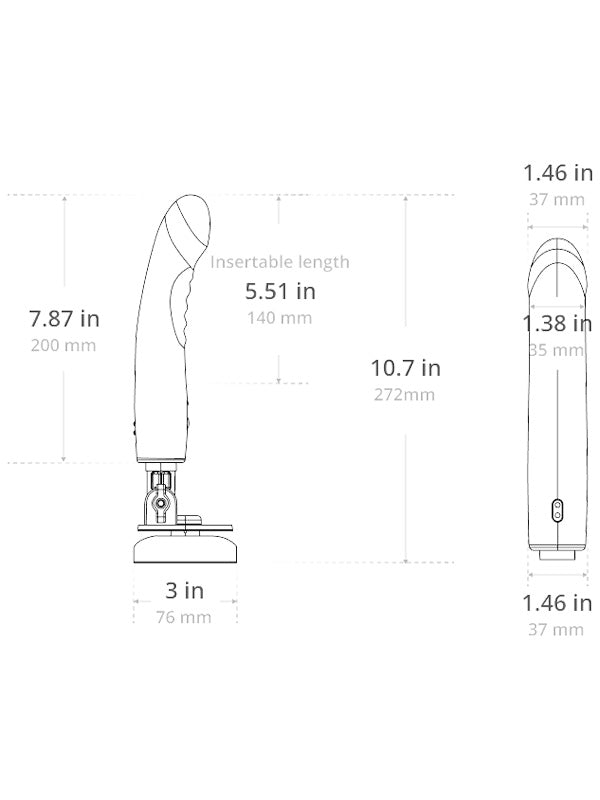- Glans width: 3.7 cm, Shaft width: 3.5 cm, Suction cup width: 7.6 cm