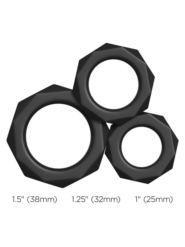 - Includes 3 silicone cock rings (2.5 cm, 3.2 cm and 3.8 cm)