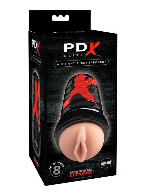 Pipedream PDX Elite Air-Tight pussy stroker features a sturdy, ribbed exterior case for a solid grip. The stroker creates a powerful suction that can be controlled by removing the suction control sticker and using your thumb to adjust the intensity. A super-smooth, lifelike Fanta Flesh interior sleeve lined with massaging ribs, bumps, and pleasing textures will fulfil your fantasies with every thrust. The sleeve can be removed for use without the case and easy cleaning. Use the included silicone cock rings for more intense sensation and harder erection.