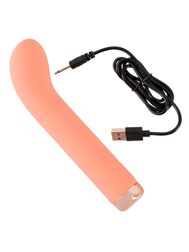 Peachy small but powerful mini G-spot vibrator made from silky soft silicone in pastel orange colour. Its curved shape and plump head are perfect for spot-on G-spot stimulation.