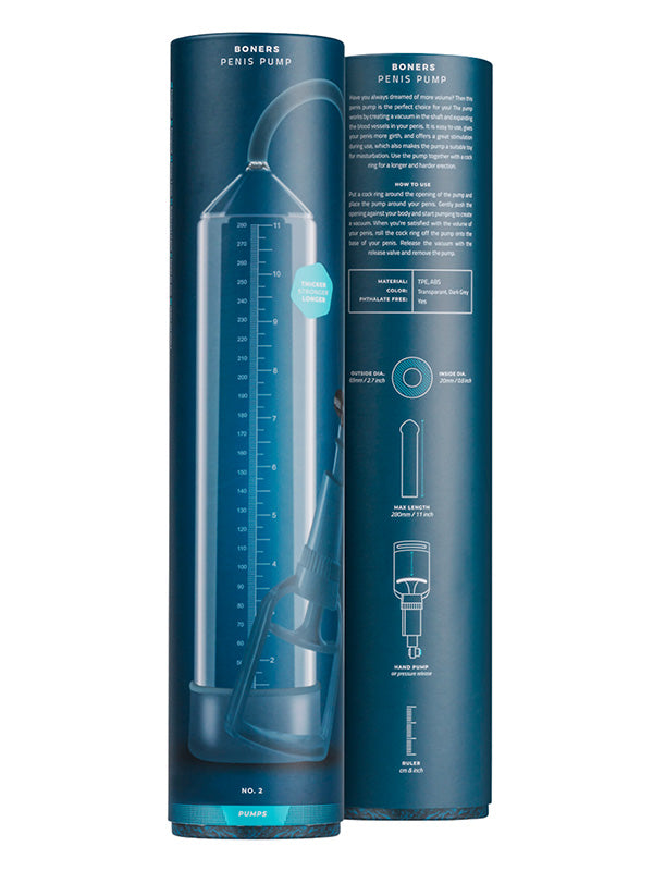Give your penis more volume with this large Boners No.2 penis pump. Apply some water-based lubricant to the opening and to your penis, and let your penis glide inside. Start pumping using the finger pump. With the air pressure release button, you can release the vacuum at any time.