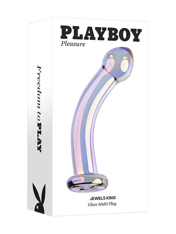 Playboy Pleasure Jewels King glass dildo boasts impressive size and invigorating curve. The bulbous teardrop head with a tapered tip makes anal and vaginal insertion comfortable and easy. Explore the length of the smooth shaft and the firm and pleasurable G-Spot or P-Spot stimulation. Made of body-safe borosilicate glass, this toy shimmers with a crystal iridescent finish and the flared anal-safe base features the iconic rabbit head design. Experience temperature play by immersing the toy in warm or cool water before use.
