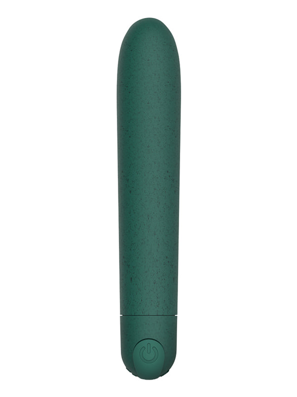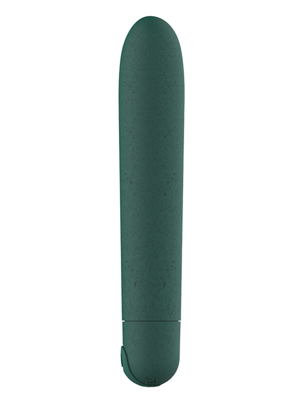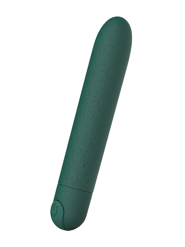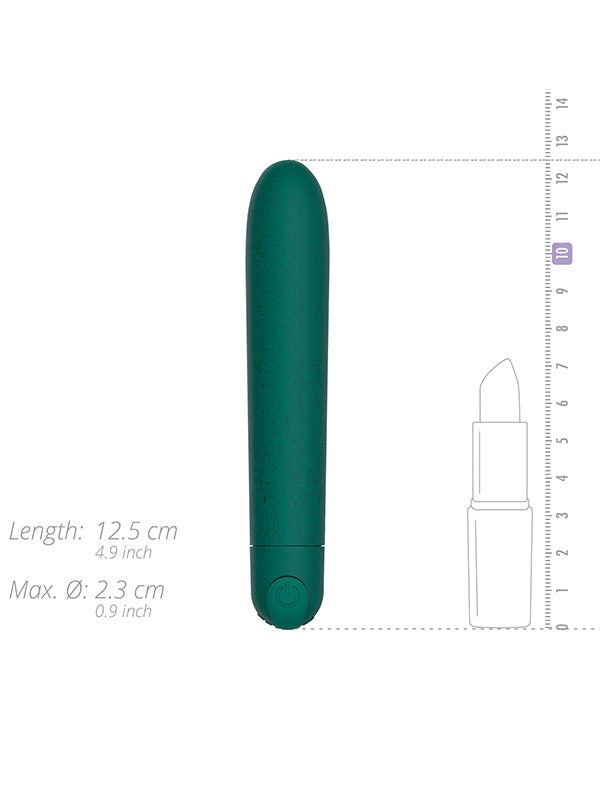 Gløv Saga Eco bullet vibrator is made from recycled ABS plastic and body-safe silicone in earthy green colour. The vibrator features 10 powerful vibration settings and is perfect for targeted stimulation due to its tapered tip. Switch easily between settings with the button on the bottom, even in the bath, as the vibrator is completely waterproof.