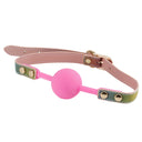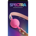 The Spectra Bondage ball gag is made from faux leather in a slightly shiny, rainbow colour and pink silicone. The ball gag features a gold-coloured metal buckle.