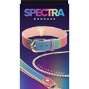 The Spectra Bondage collar and leash are made from faux leather in a slightly shiny, rainbow colour. The collar features a gold-coloured metal buckle and a ring for attaching other bondage accessories, such as the included matching leash with loop handle.