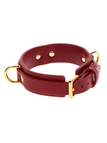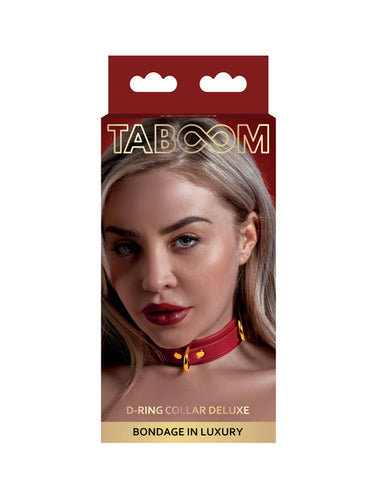 TABOOM Bondage collection Deluxe D-Ring collar is made of gorgeous, deep red faux leather and features 3 gold metal D-rings for attaching ropes, cuffs or other accessories of your choosing to satisfy all your kinky desires.