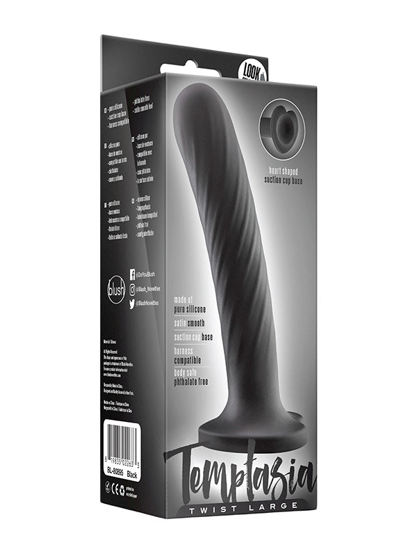The Blush Temptasia Twist Large delivers a swirling texture that's perfect for gentle G-spot or anal stimulation! The heart-shaped base includes a strong suction cup and is harness-compatible. The Temptasia Twist is a fun addition to your playtime, solo or with your partner. Its girth makes it an excellent choice for anyone who's looking for a thicker toy. Made of 100% platinum-cured body-safe silicone the toy is easy to clean with gentle soap and water.
